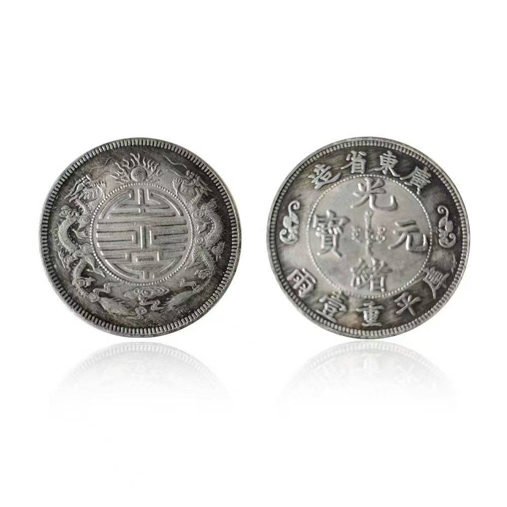 1. 正面文字与版式设计:银币正面中央为“光绪元宝”四字,采用楷书书写,笔法刚劲有力,是清代宫廷钱币的标准字体;上方环刻“广东省造”,下方标注“库平重壹两”,左右两侧饰以蝙蝠纹,“蝠”与“福”谐音,寓意“福在眼前”。文字的布局遵循中心对称原则,字体大小适中,与周边纹饰形成和谐的视觉效果,体现了清代钱币设计的规范性与审美性。