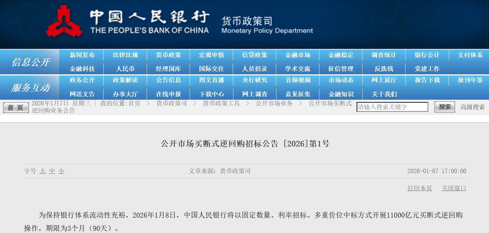 1月7日,央行公告,为保持银行体系流动性充裕,2026年1月8日,中国人民银行将以固定数量、利率招标、多重价位中标方式开展11000亿元买断式逆回购操作,期限为3个月(90天)。