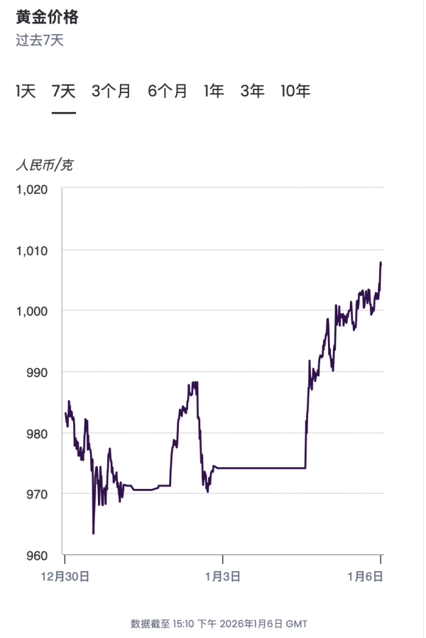 据世界黄金协会数据,过去7天里黄金价格再次冲破千元每克。1月5日,国际金价直线拉涨,现货黄金冲破4400美元,周生生足金饰品价格一夜暴涨22元/克至1376元/克。周大福、潮宏基、老庙黄金、老凤祥等品牌的进价涨幅也都超过20元。