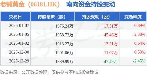 证券之星消息,1月7日南向资金增持17.51万股老铺黄金(06181.HK)。近5个交易日中,获南向资金增持的有4天,累计净增持38.77万股。近20个交易日中,获南向资金增持的有10天,累计净增持49.23万股。截至目前,南向资金持有老铺黄金(06181.HK)1976.24万股,占公司已发行普通股的13.79%。