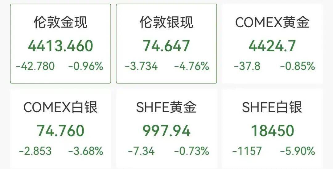 1月8日晚间,黄金、白银再次出现跳水行情。截至北京时间20:20左右,伦敦金现跌至4413美元/盎司,伦敦银现跌破75美元关口,报74.6美元/盎司。