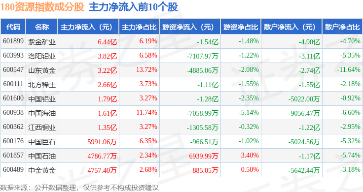 资金流向方面,180资源(000026)指数成份股当日主力资金净流入合计18.64亿元,游资资金净流出合计2.49亿元,散户资金净流出合计16.15亿元。成份股资金流向详情见下表: