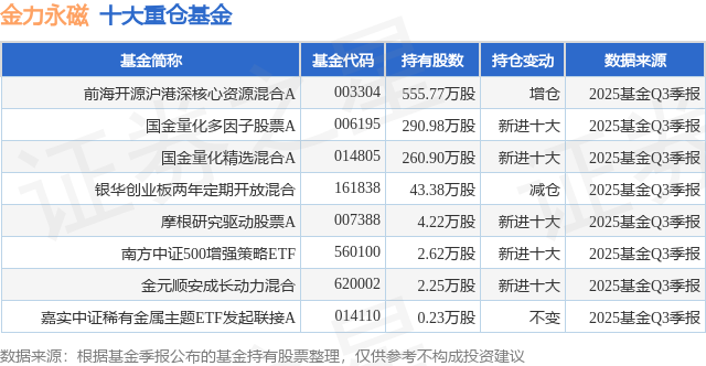 根据2025基金Q3季报公募基金重仓股数据,重仓该股的公募基金共8家,其中持有数量最多的公募基金为前海开源基金的前海开源沪港深核心资源混合A。前海开源沪港深核心资源混合A目前规模为6.86亿元,最新净值4.903(1月8日),较上一交易日下跌2.43%,近一年上涨76.62%。该公募基金现任基金经理为吴国清。吴国清在任的基金产品包括:前海开源一带一路混合A,管理时间为2019年7月19日至今,期间收益率为-22.25%;前海开源沪港深农业混合A,管理时间为2020年7月20日至今,期间收益率为-29.98%;前海开源金银珠宝混合A,管理时间为2021年6月1日至今,期间收益率为108.07%。