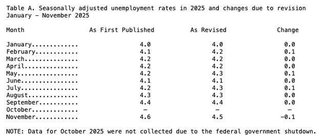 受去年底美国政府创纪录停摆的影响,非农报告直到今天才恢复按时发布状态。最新报告也调整了前两个月的就业人数,其中11月从增加6.4万人下修至5.6万人,10月从减少10.5万人下修至减少17.3万人,两个月合计下修7.6万人。