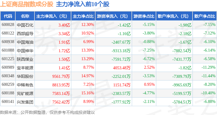 资金流向方面,上证商品(000066)指数成份股当日主力资金净流出合计18.0亿元,游资资金净流入合计5.07亿元,散户资金净流入合计12.93亿元。成份股资金流向详情见下表: