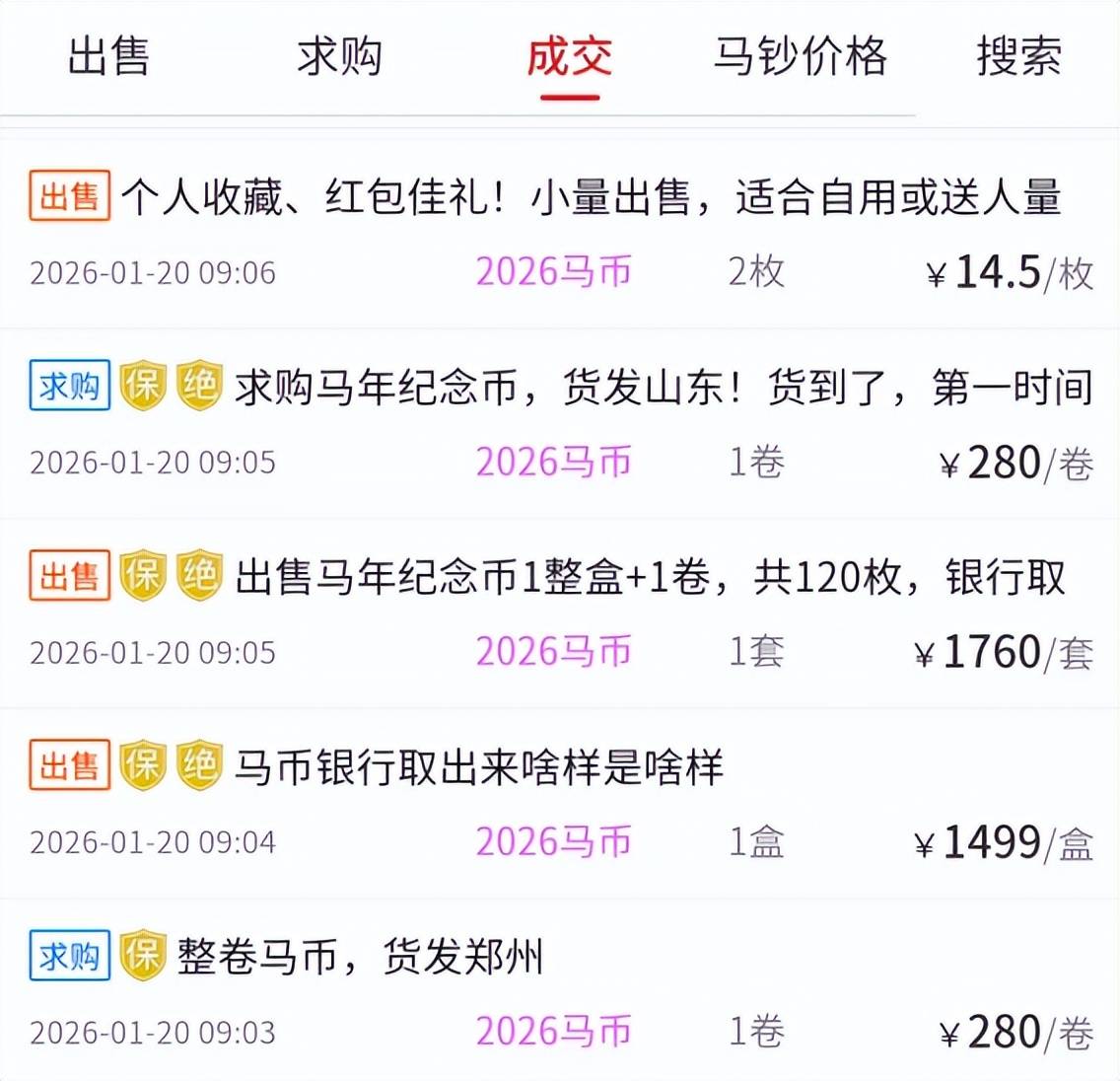 目前,马年纪念币成交价在14到15元之间。