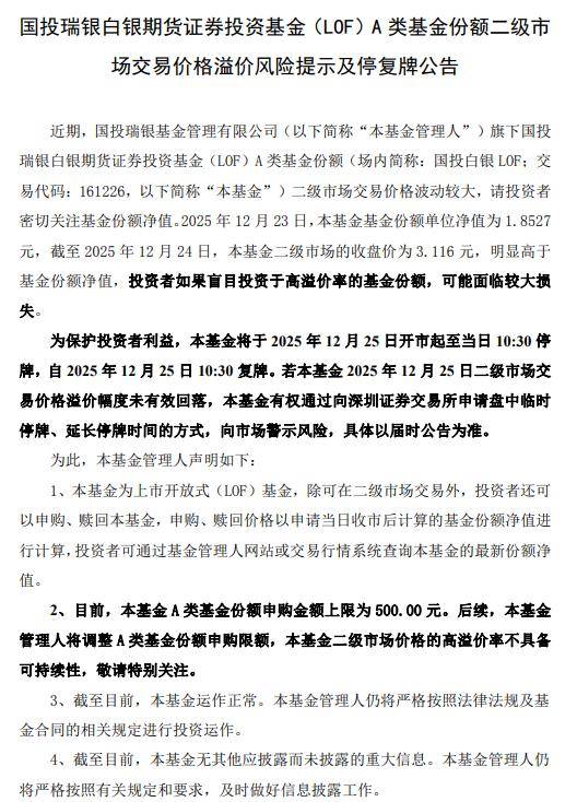 24日盘后,国投白银LOF公告,截至12月24日,本基金二级市场的收盘价明显高于基金份额净值,投资者如果盲目投资于高溢价率的基金份额,可能面临较大损失。为保护投资者利益,本基金将于2025年12月25日开市起至当日10:30停牌,自2025年12月25日10:30复牌。目前,本基金A类基金份额申购金额上限为500.00元。后续,本基金管理人将调整A类基金份额申购限额,本基金二级市场价格的高溢价率不具备可持续性,敬请特别关注。