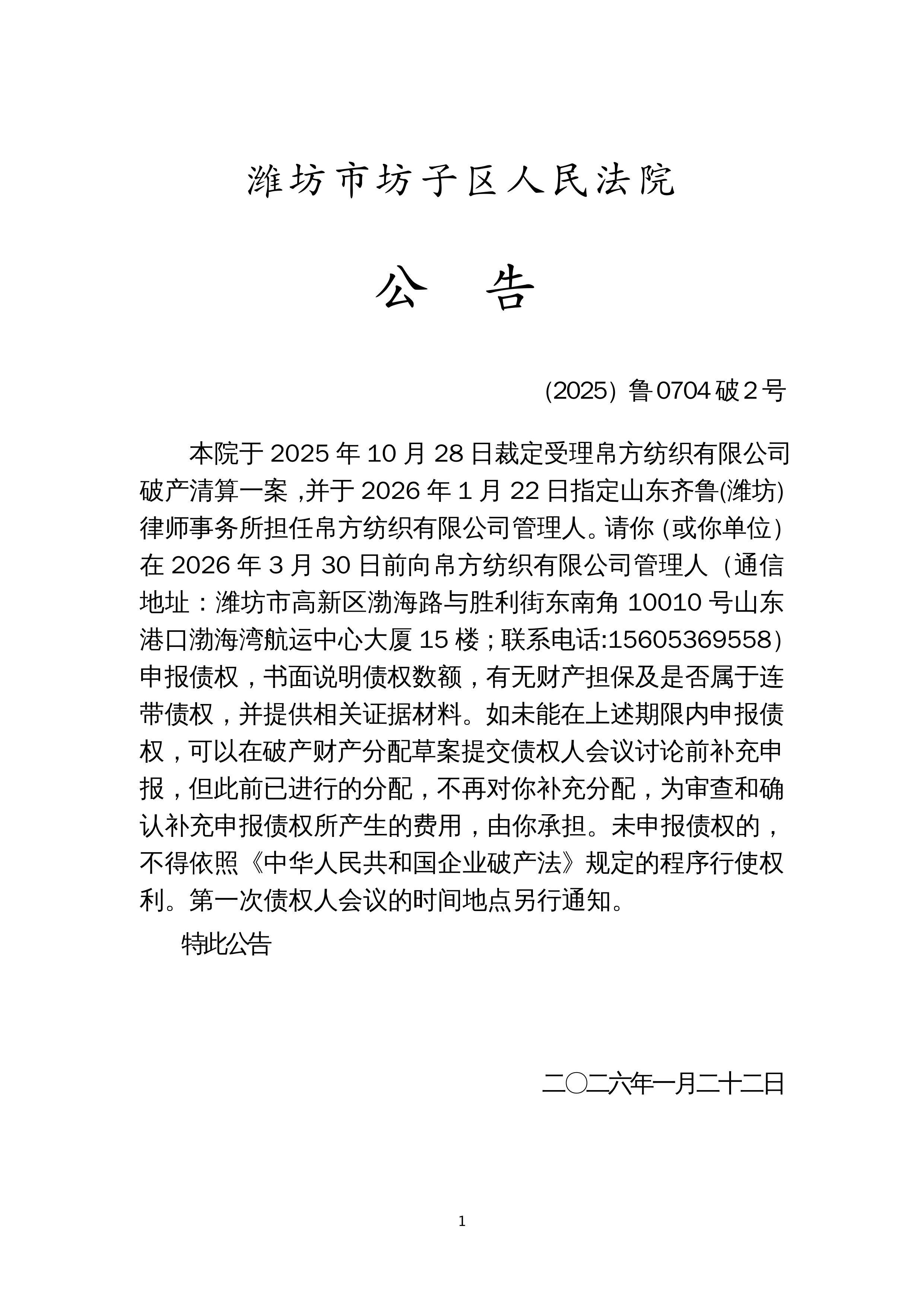 (2025)鲁0704破2号公告(受理破产清算申请用)