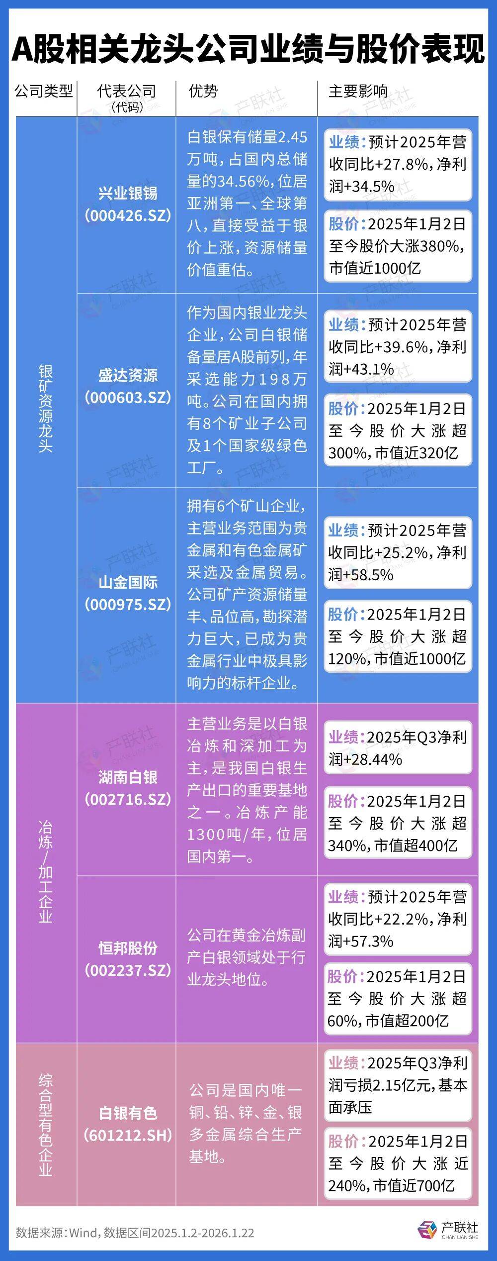 在产业链中,受益最明显的是上游的白银矿产龙头,其中兴业银锡(000426.SZ)白银保有储量2.45万吨,占国内总储量的34.56%,位居亚洲第一、全球第八,直接受益于银价上涨,资源储量价值重估。盛达资源(000603.SZ)作为国内银业龙头企业,公司白银储备量居A股前列,年采选能力198万吨。从2025年1月2日至今,这两家公司股价涨幅均超过300%,公司业绩大增。