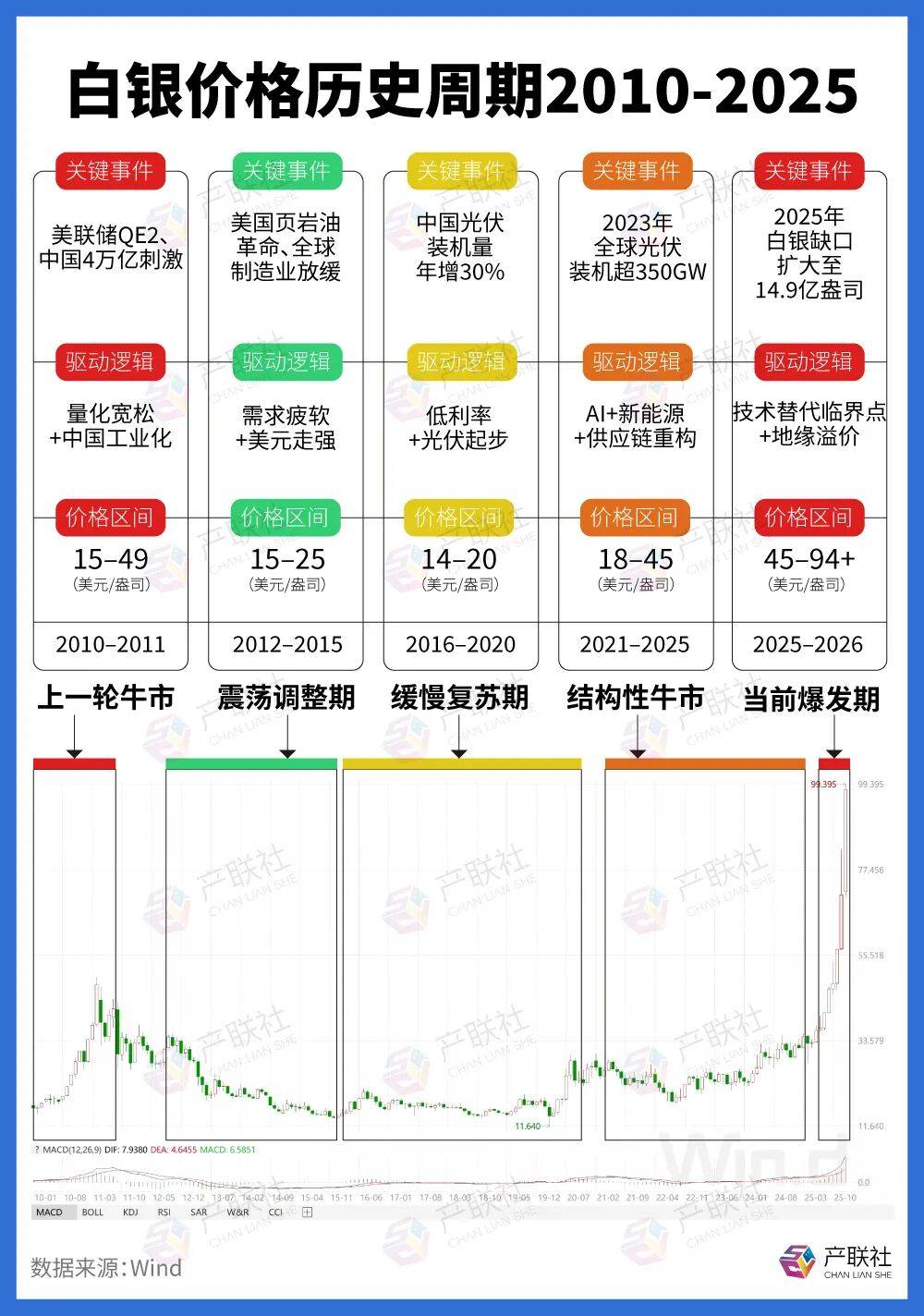 2021年至今的结构性牛市,AI、新能源和供应链重构成为主要驱动力,2023年全球光伏装机超350GW,推动白银价格从18美元上涨至45美元。2025年至今的超级周期爆发,技术替代临界点和地缘溢价推动价格突破90美元/盎司。