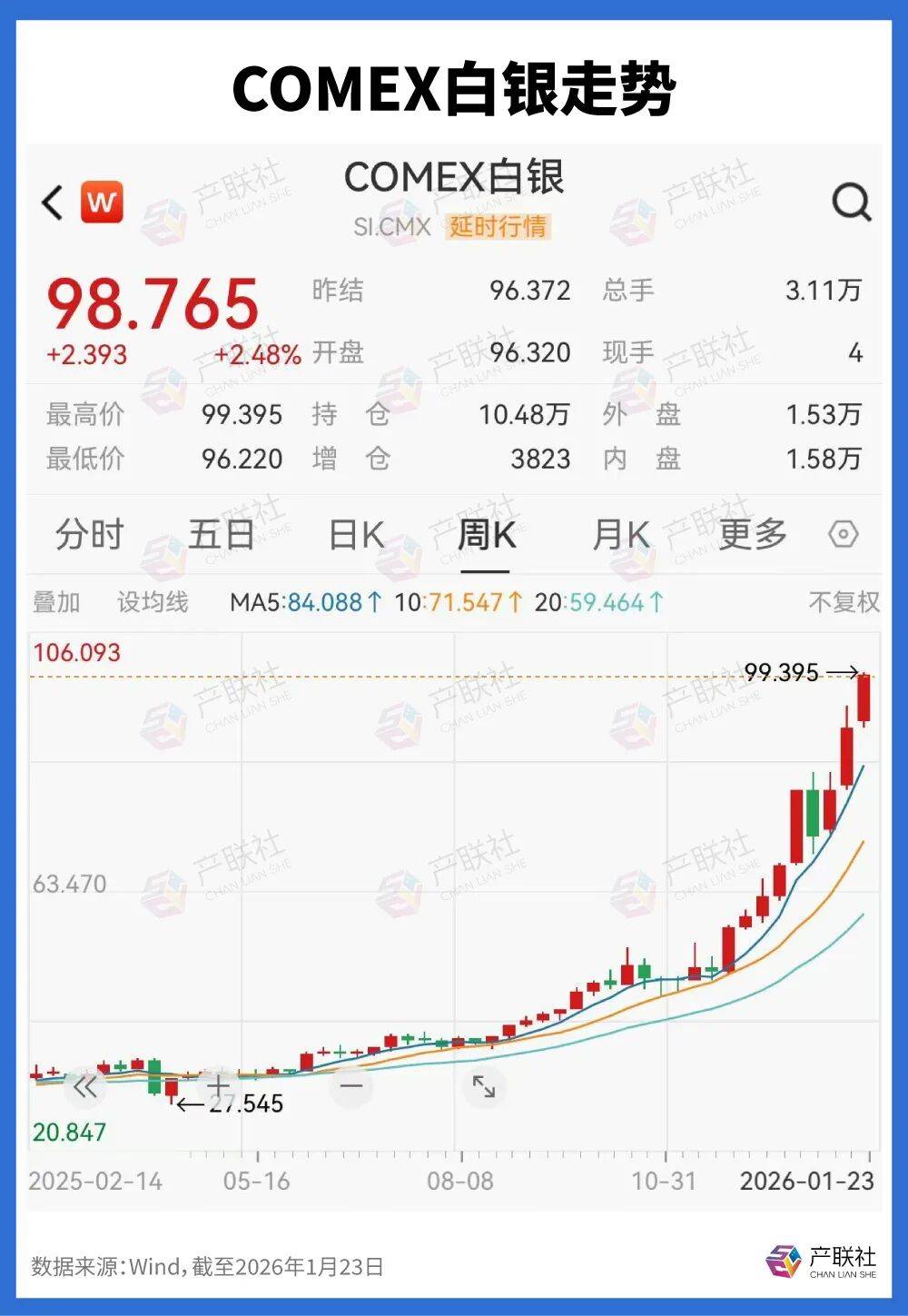白银冲击百元倒计时,谁是助推的... 文 | 产联社CLS 1月23日,金银价格再度冲高,白银期现货价格冲破每盎司99美元关口,创下历史...
