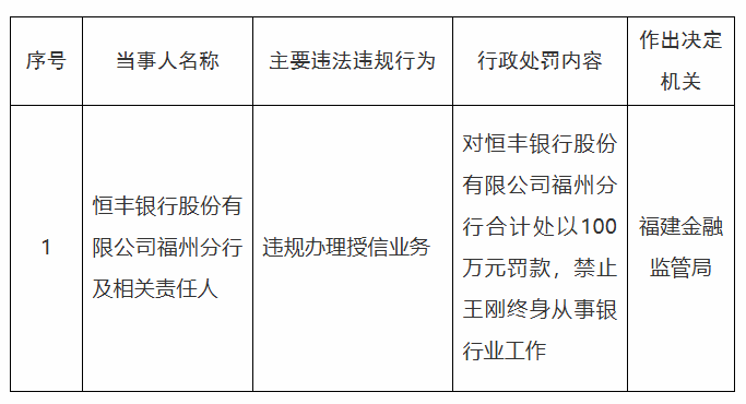 【大河财立方消息】1月24日消息,福建金融监管局日前披露的行政处罚信息公示表显示,因违规办理授信业务,恒丰银行股份有限公司福州分行被罚100万元。