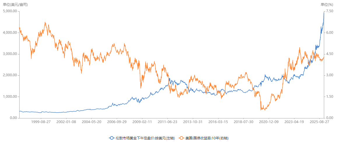 事实上,在传统模式下,黄金作为不生息资产,其价格与美债收益率呈负相关。但2022年以来,在金价上涨的同时,美国国债收益率整体上呈现上升趋势。这被市场解读为,美元资产的吸引力和美债的安全性遭到了市场质疑,进而出现了美国资本外逃的信号。