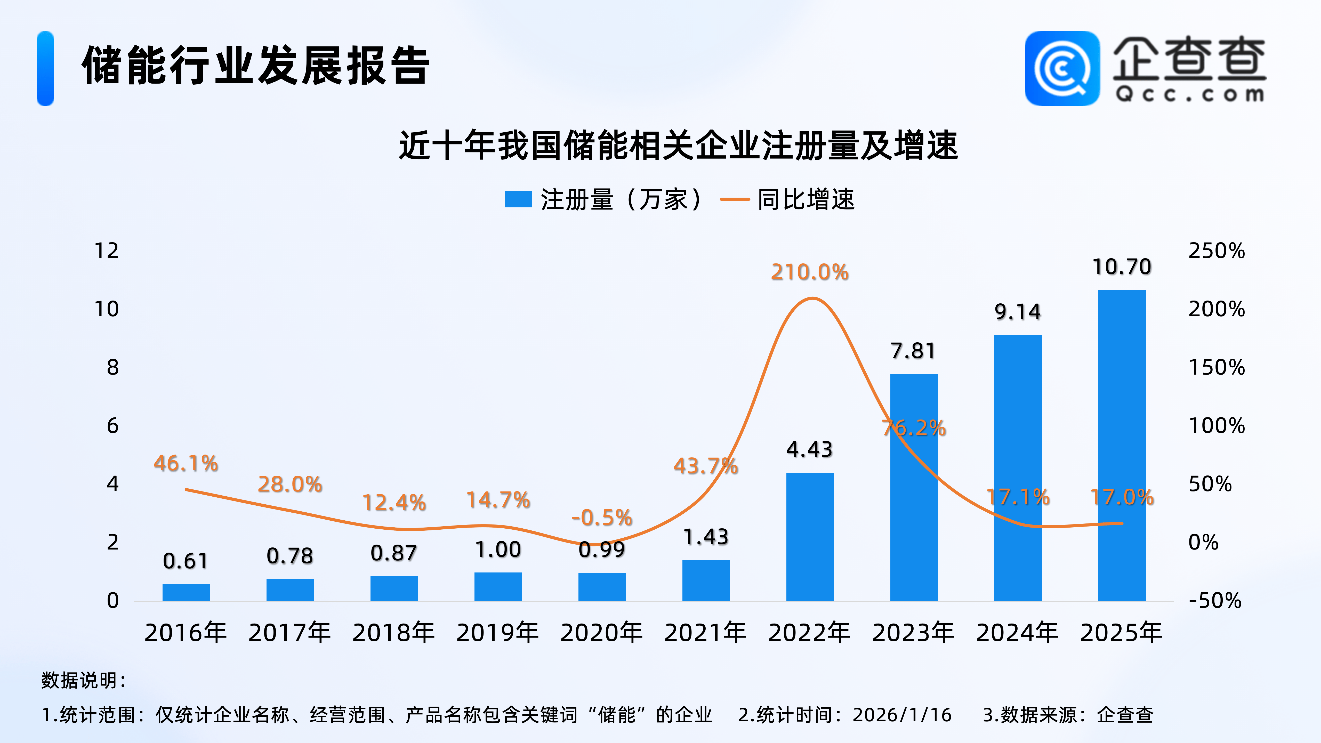 企查查数据显示,近十年,我国储能相关企业每年注册量基本逐年增加,尤其是2022年,全年注册量同比激增210.0%至4.43万家,达近十年注册量增速峰值,2025年全年,我国储能相关企业注册量同比增加17.0%至10.70万家,创近十年储能相关企业年度注册量新高。