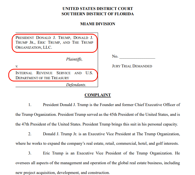 特朗普(Donald Trump)及其长子小唐纳德·特朗普(Donald Trump Jr.)、次子埃里克·特朗普(Eric Trump)和特朗普集团(Trump Organization)于2026年1月29日(当地时间)向美国佛罗里达州南区联邦法院提起的民事诉讼。