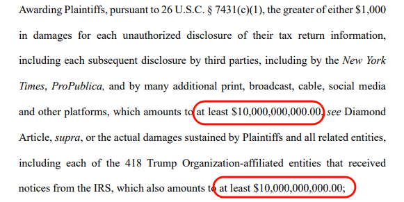 在诉状的最后,特朗普要求两个政府部门赔偿 最低100亿美元