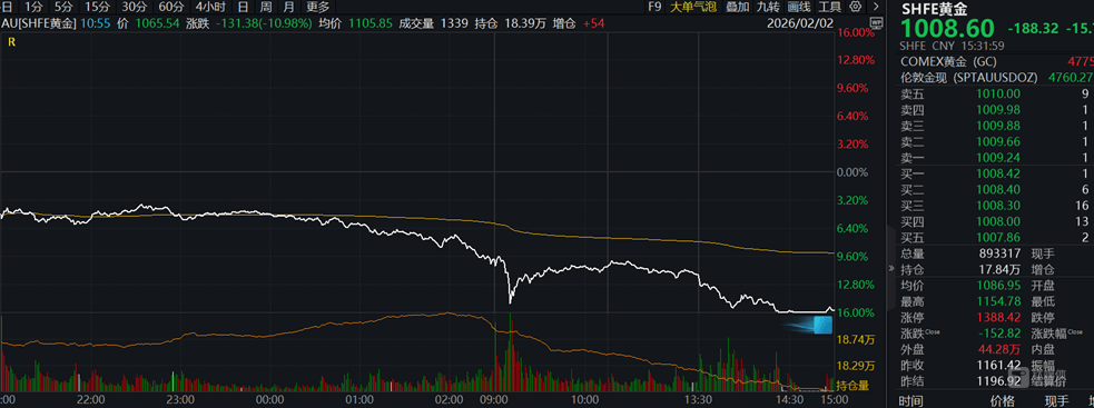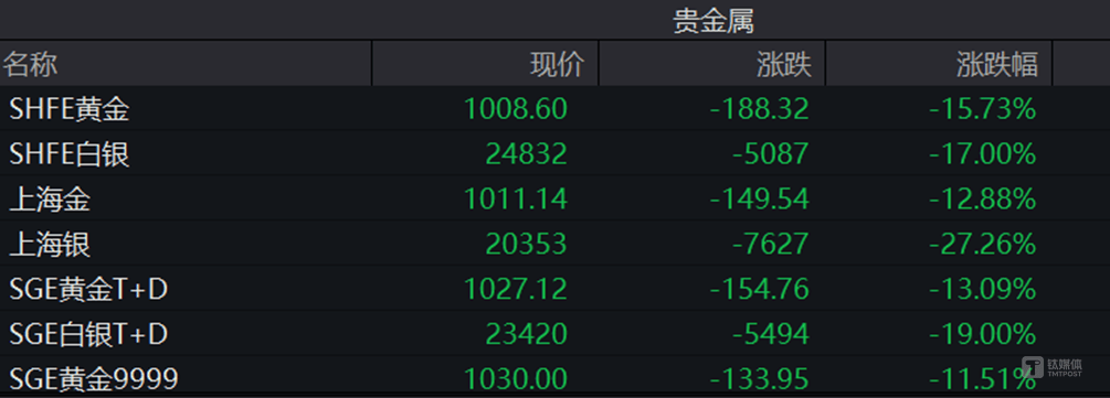 其中,沪金期货主力合约一度触及跌停,最低触及1005.4元/克,收盘打开跌停,跌幅为15.73%,创该品种上市以来最大跌幅。至此,黄金、白银、铜等有色品种,2个交易日就将过去一个月的涨幅都跌去,波动之剧烈相当罕见。