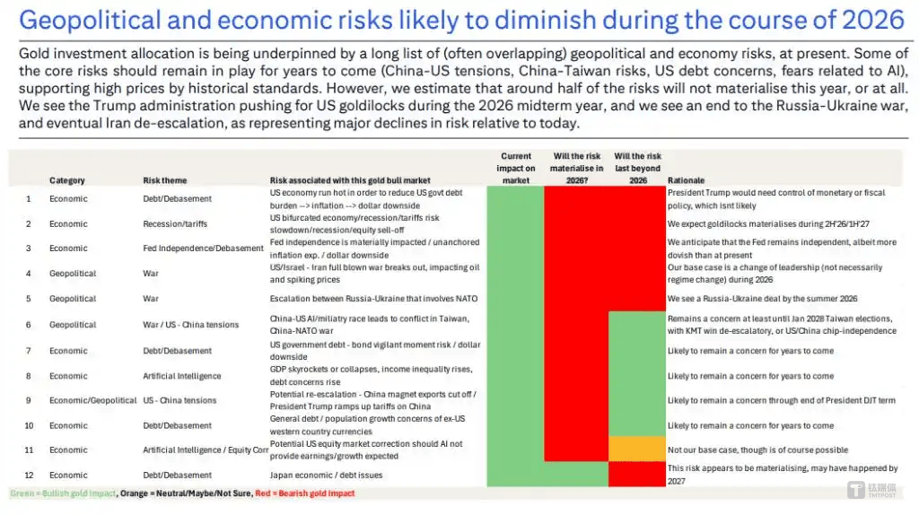 花旗亦在1月30日的最新大宗商品研报中警告:金价支柱面临坍塌,“当前的黄金价格已严重透支了未来的不确定性,估值已达到极端水平”,全球黄金支出占GDP比例飙升至0.7%,为55年来最高。若黄金配置比例回归0.35%-0.4%的历史常态,金价将面临“腰斩”风险。 该行全球大宗商品主管Maximilian Layton认为,虽然短期内金价仍有冲高可能,但其估值已达到“极端水平”。随着2026年下半年避险情绪的集体消退(俄乌冲突有望达成协议、美国经济上行及美联储独立性确认),支撑金价的“支柱”可能面临结构性坍塌。