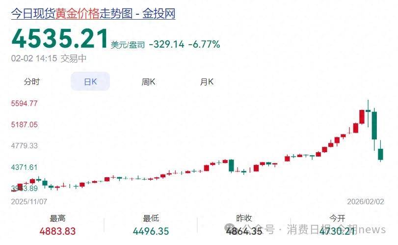 据红星新闻报道,1月30日国际金价接连失守整数关口,单日跌幅超11%,白银价格更是以31.37%的断崖式下跌创下自1980年3月以来最差单日表现。从周线来看,上周五的大幅下跌,抹去了本周之前几个交易日带来的全部涨幅,其中国际金价累计下跌4.71%,国际银价累计下跌22.50%。