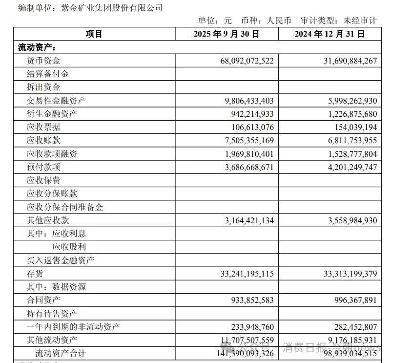 截至2025年9月30日,紫金矿业拥有货币资金约691亿元、交易性金融资产98亿元,最新一笔280亿元收购款占其货币资金的四成多;同期还有大量负债。