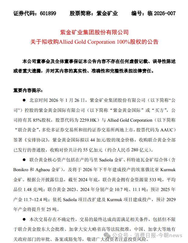 就在几天前,紫金矿业再次出手,发布公告称公司控股的紫金黄金国际计划以44加元/股的现金价格收购加拿大Allied Gold Corporation(联合黄金)全部已发行的普通股,收购对价共计约人民币280亿元,以获得3个非洲金矿项目。
