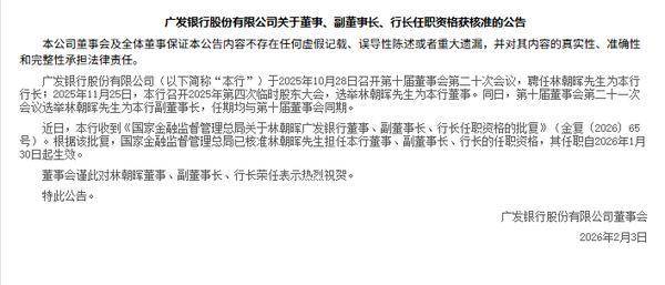 中国网财经2月5日讯 2月3日,广发银行发布公告称,该行收到《国家金融监督管理总局关于林朝晖广发银行董事、副董事长、行长任职资格的批复》(金复﹝2026﹞65号)。根据该批复,国家金融监督管理总局已核准林朝晖担任广发银行董事、副董事长、行长的任职资格,其任职自2026年1月30日起生效。