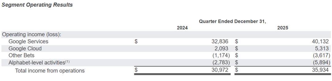 其中,Alphabet在2025年第四季度Google Services运营利润为401.32亿美元,上年同期为328.36亿美元;来自Google Cloud运营利润为53.13亿美元,上年同期的运营利润为20.93亿美元。