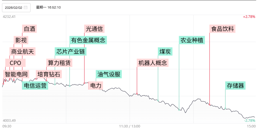 财联社2月2日讯,今日36股涨停,18股炸板,封板率为67%,皇台酒业、横店影视、万丰股份3连板。市场全天震荡调整,三大指数均跌超2%,科创50指数跌超3%。沪深两市成交额2.58万亿,较上一个交易日缩量2508亿。盘面上,全市场超4600只个股下跌,其中123只个股跌停。板块方面,电网设备、白酒、食品饮料板块领涨;有色金属、油气、半导体方向跌幅靠前。截至收盘,沪指跌2.48%,深成指跌2.69%,创业板指跌2.46%。