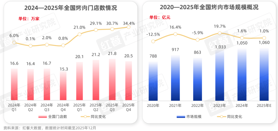 过去,火锅、烤肉、小吃快餐等品类,因模式易复制、准入门槛低,吸引大量小白入局,经历爆发式增长的阶段后,市场趋于饱和,扩张节奏持续放缓。以烤肉赛道为例,据红餐大数据,其市场规模增速已从2023年的19.7%降至2025年的1%。