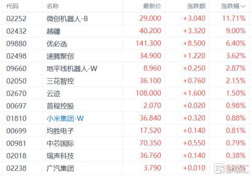 机器人概念股上扬,微创机器人涨超11%,越疆、优必选、速腾聚创、地平线机器人、三花智控、云迹等跟涨。