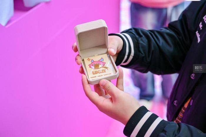 帘子掀开了。胖胖龙的毛绒爪子托着一个棕色的小盒子伸了出来,盒内黑色的植绒布上,静置着一枚纯金的“铲铲”,盒盖上还附着一张印有“Lucky”字样的卡片。