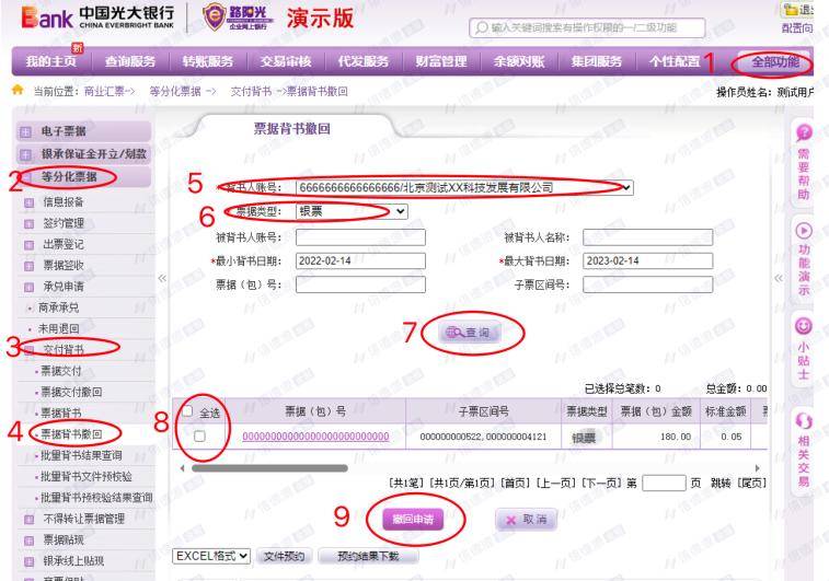 接下来点击 全部功能 - 商业汇票 - 等分化票据 - 交付背书 - 票据背书撤回,选择背书人账号,票据类型选择“银票”,再点“查询”,只要是符合条件可供撤销的新一代银票,都会在列表中显示出来。选择需要撤销的银票,再点“撤回申请”。