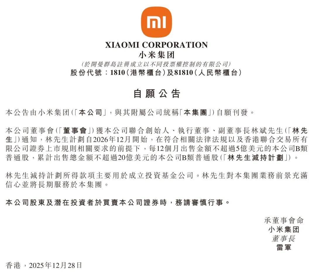 小米今日发布公告称,董事会获公司联合创始人、执行董事、副董事长林斌通知,林斌计划自2026年12月开始,每12个月出售金额不超过5亿美元的公司B类普通股,累计出售总金额不超过20亿美元的公司B类普通股。