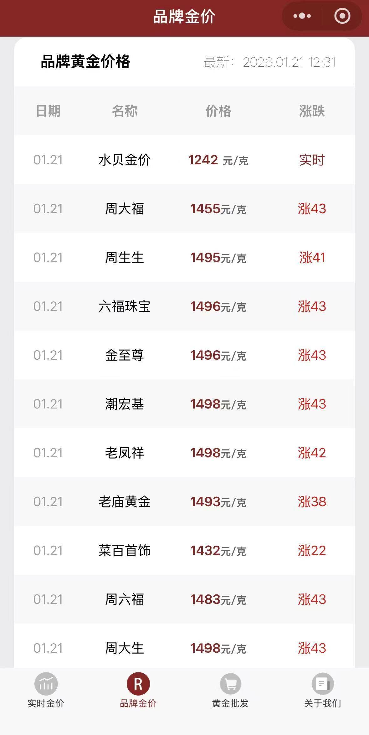 1月21日,现货黄金突破4850美元/盎司,续创新高,日内上涨1.82%。与此同时,国内金饰品牌价格飙升,多个金饰品牌克价较昨日暴涨43元/克,#金饰价涨到1495元#等黄金相关词条登上热搜榜,引发广泛关注。