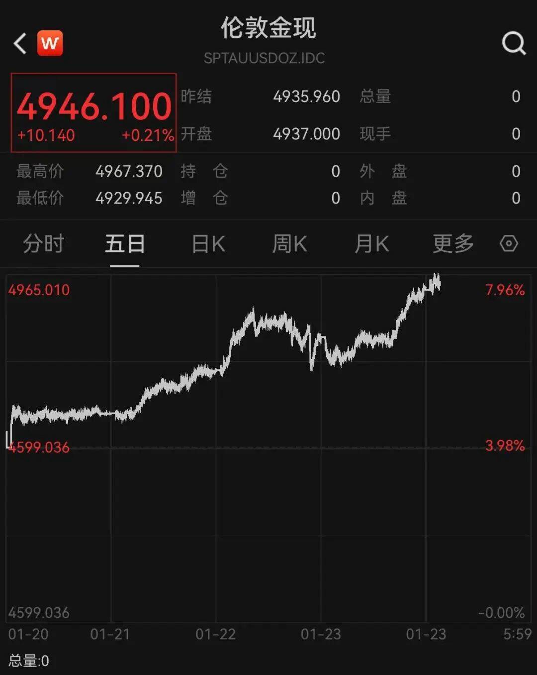 23日早盘,现货黄金持续拉涨,盘中最高突破4967美元/盎司。截至发稿,报4946.100美元/盎司,涨0.21%。