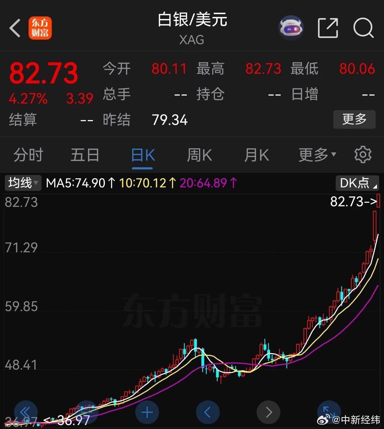 【#白银继续狂飙#】#现货白银涨破80美元# 国际现货白银周一开盘突破80美元/盎司后,继续快速拉升,突破82美元/盎司。分析认为,当前投资者和工业界对白银的需求近乎“来者不拒”。在投资方面,这种贵金属同时被以实物和金融资产两种形式大量囤积,用于储存财富并对冲美元及其他货币面临的风险。