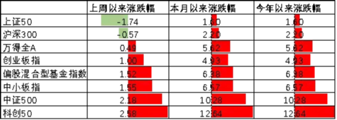 上周主要板块有所上行,其中上证50跌1.74%,跌幅最大;科创50涨2.58%,涨幅最大。央行下调再贷款利率叠加国内出口及贷款数据走强带动市场情绪上行,在此背景下A股出现了一定的上行。偏股基金指数涨1.52%。