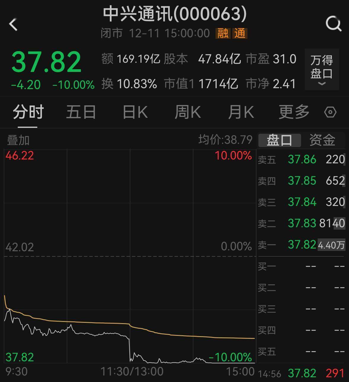 不过,声明发布后,其股价颓势未改,投资者情绪持续承压。截至收盘,中兴通讯A股跌停,报收37.82元/股(前复权,下同),换手率高达14.21%,成交额突破169亿元,市值缩水至1809亿元。港股跌至27.50港元/股,跌幅达13.08%,换手率达14.08%。