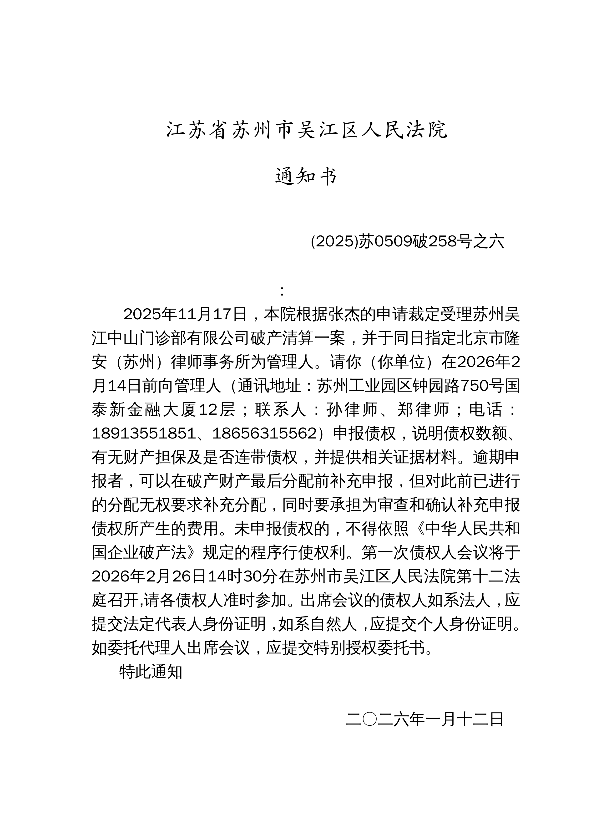 (2025)苏0509破258号通知书之六(致已知债权人)