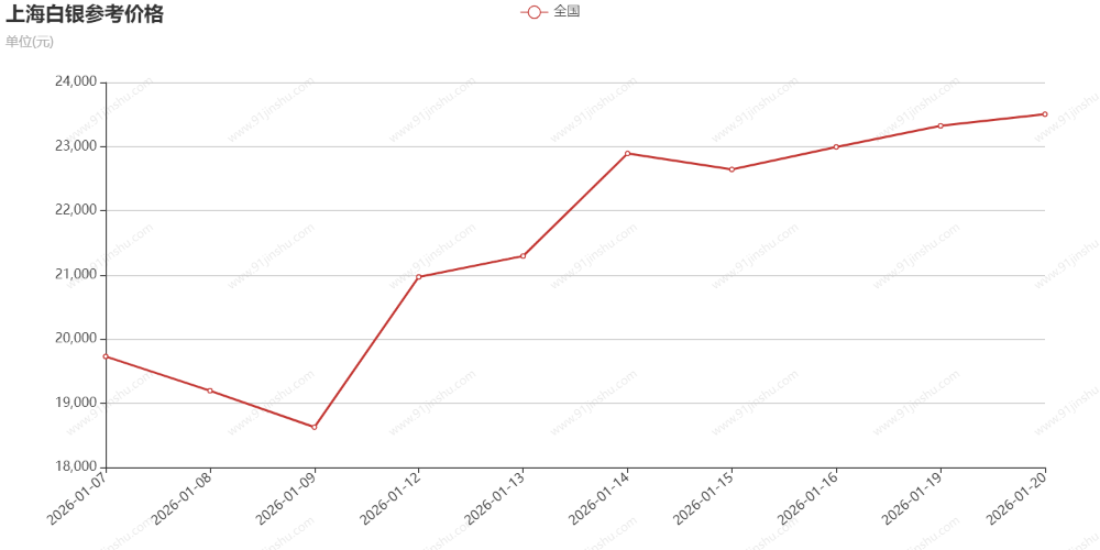 2026年1月20日,91金属网今日出品的上海白银参考价格:上午报价23610,价格范围:23590-23630;下午报价23400,价格范围:23380-23420。单位:元/千克,品牌:豫光、万洋、宏达、济金、索日、大江、铜冠、水口山等上期所交割品牌!报价含税,中下游购销请以基准价±升贴水为准!