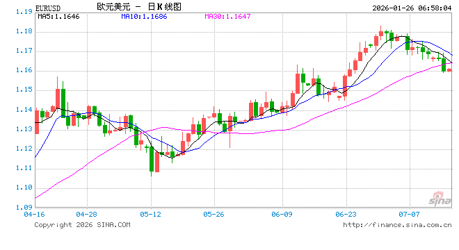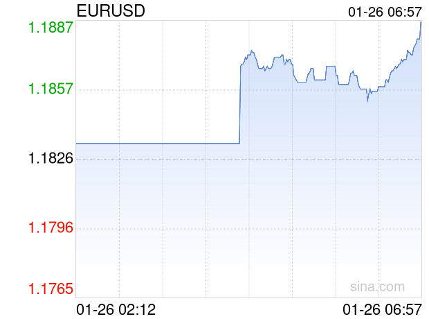 新浪外汇消息2026年01月26日,截至06时57分,外汇市场上欧元兑美元汇率突破1欧元兑换1.1887美元。涨幅为0.5158%