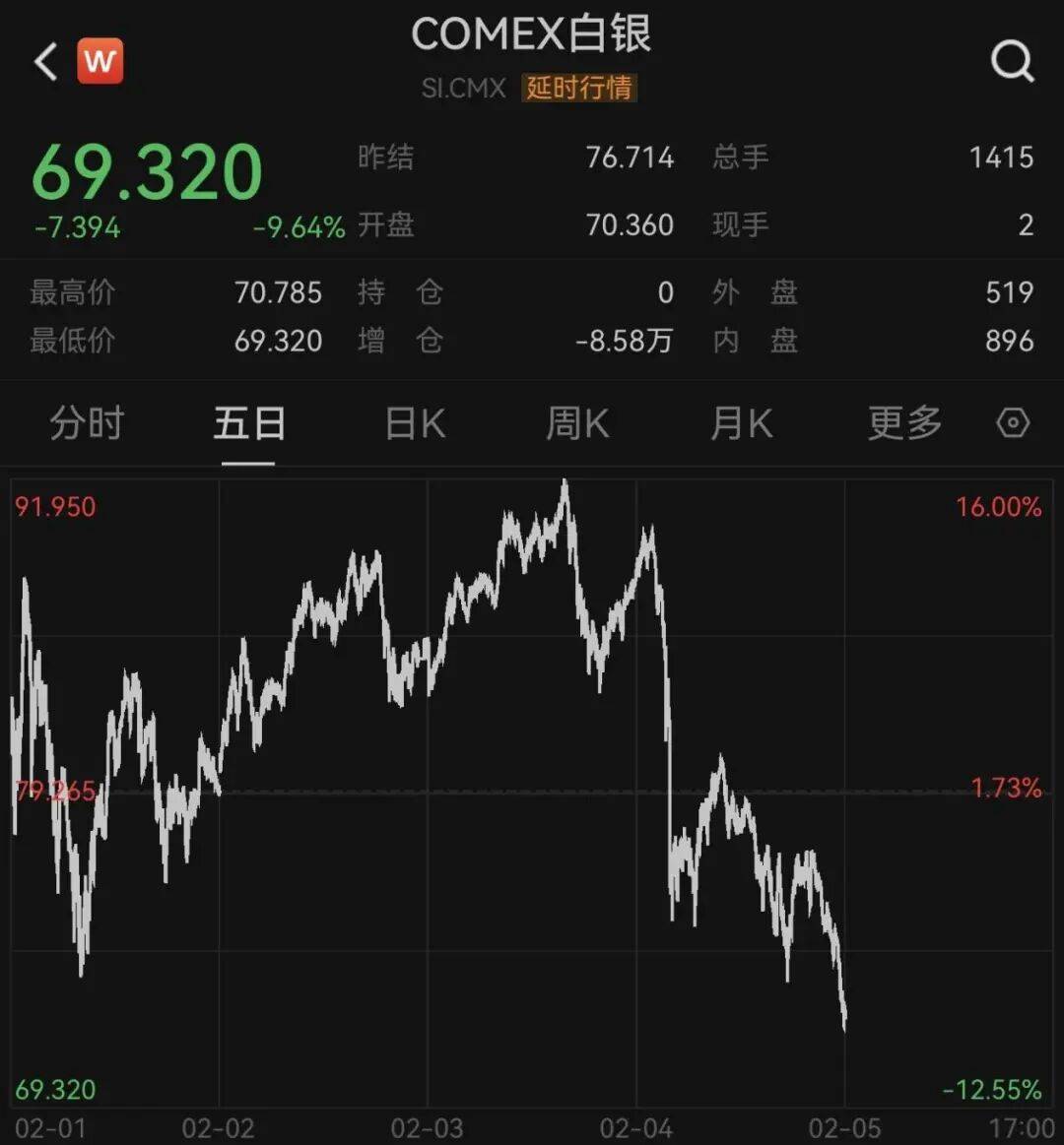 白银重挫,周四一度跌18%。现货白银美股周四收盘时报72.12美元/盎司。截至发稿前,已经跌破70美元/盎司。