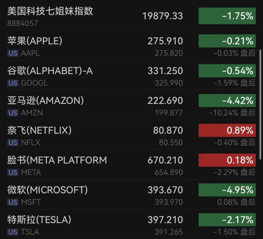 大型科技股多数下跌,微软跌近5%,亚马逊跌超4%,特斯拉跌逾2%,英伟达跌超1%,谷歌跌0.54%,苹果跌0.21%,脸书涨0.18%。