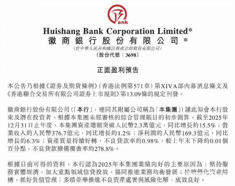 徽商银行强调,以上数据为初步测算,实际业绩或存差异,详细信息将于2026年3月底前发布的年度业绩公告中披露。