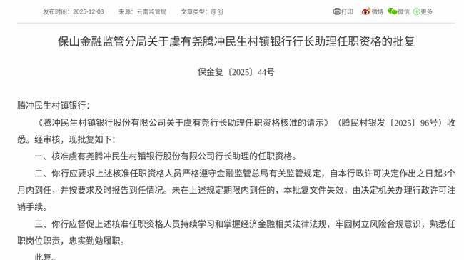2025年12月3日,根据国家金融监督管理总局消息,《腾冲民生村镇银行股份有限公司关于虞有尧行长助理任职资格核准的请示》获得通过,批复虞有尧腾冲民生村镇银行股份有限公司行长助理的任职资格。