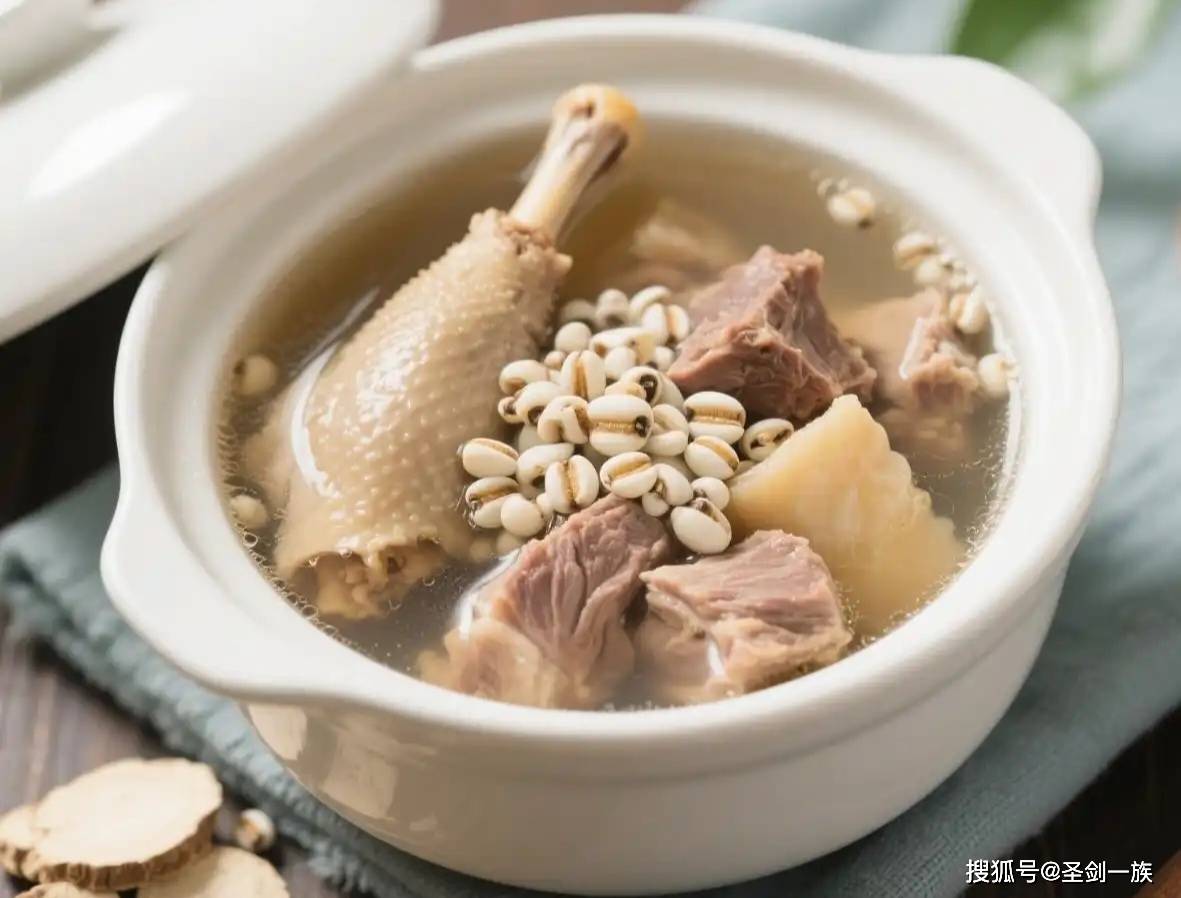所需食材:水鸭半只(约900 g)、炒薏米80 g、茯苓片20 g、赤小豆50 g、陈皮1瓣、生姜3片、料酒1大勺、清水2.5 L、食盐适量