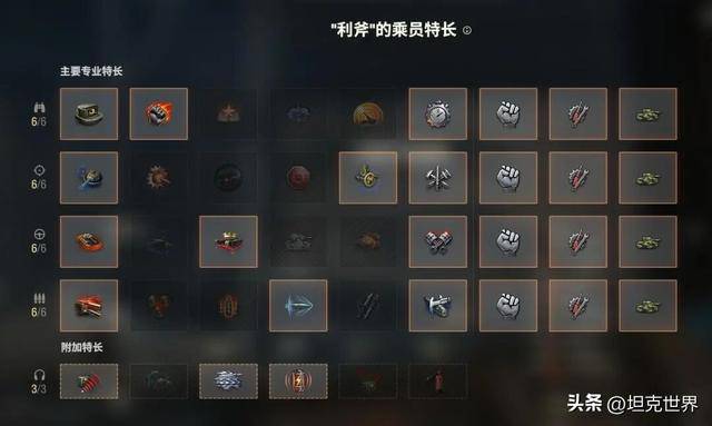 在乘员技能方面,可以参考上图方案进行选择。中型坦克的基础技能就是兄弟连、修理、侦察、态势感知、熟能生巧、人工稳定等技能。除此之外也可以在平稳行驶、机械达人等技能上进行选择。利斧可以考虑学习隐蔽技能来强化该特性,方便它在逆风局势下隐匿自己的行踪进行战斗。