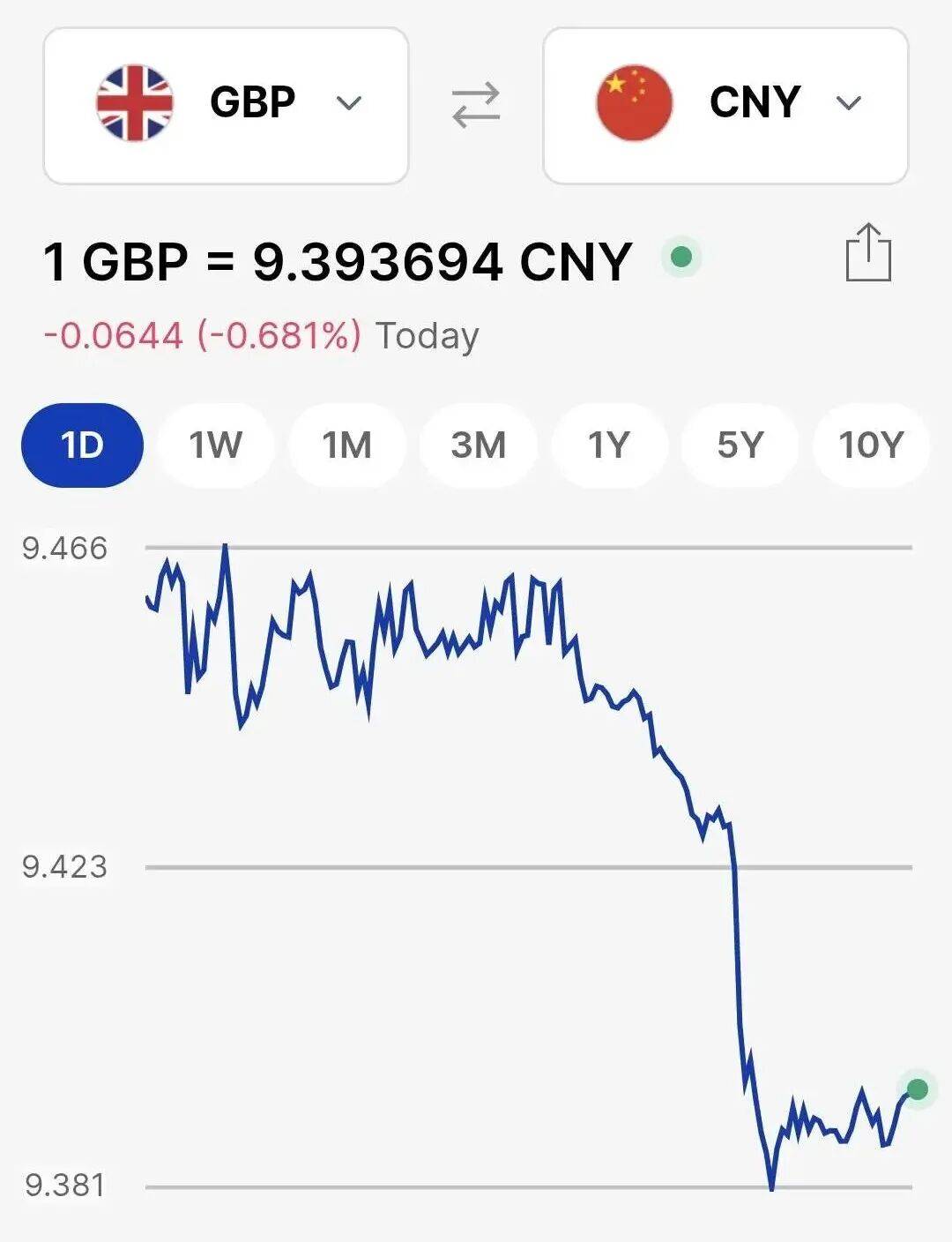 下为过去24小时英镑兑人民币汇率走势,一度跌至9.38,同样触及一周以来的最低点。