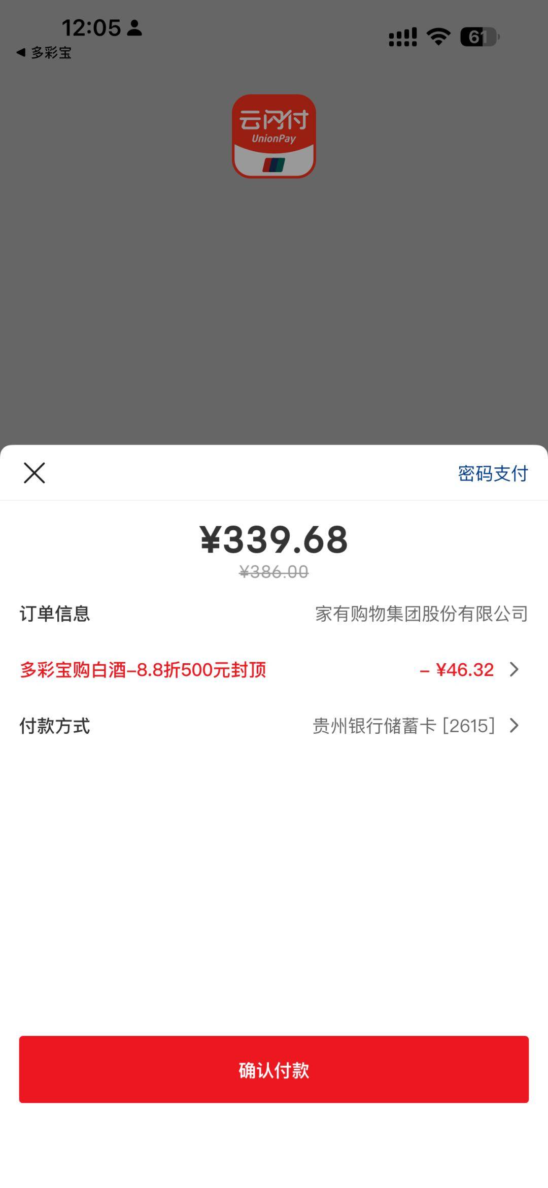 在订单页面,务必选择“云闪付” 作为支付方式。