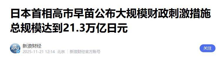 与此同时,高市早苗在11月21日当天还急忙出台了一项经济对策,她认为,当前最迫切需要的就是经济刺激。于是,她通过了一个21.3万亿日元的刺激计划,但由于规模庞大,市场反应十分强烈,甚至将其比作特拉斯风暴,暗示其可能带来更严重的后果。